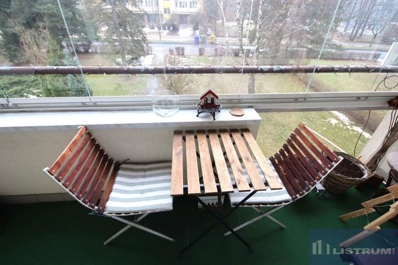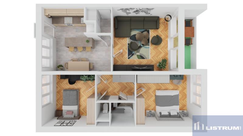 Byt je tvořen kuchyní propojenou s jídelnou (17 m2) a se vstupem na malý balkón, obývacím pokojem (19 m2) se vstupem na zasklenou lodžii s posezením (5 m2), dvěma ložnicemi (15 m2 a 12 m2), koupenou, WC a vstupní chodbou.