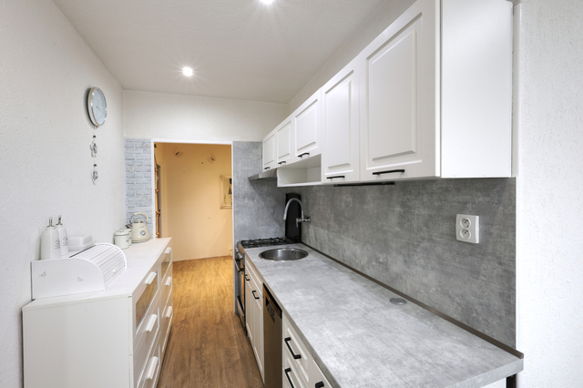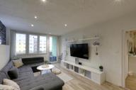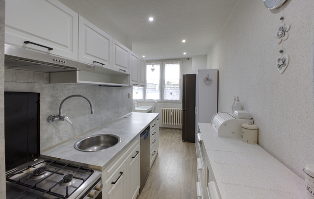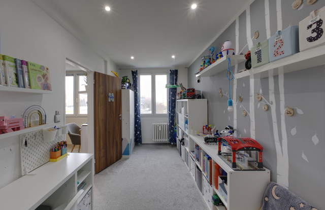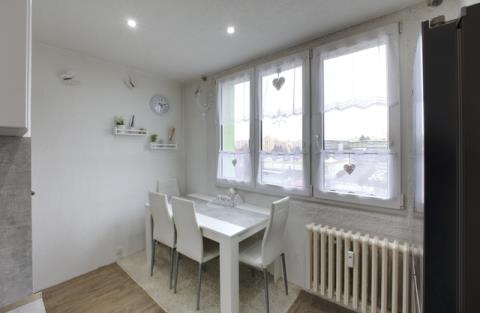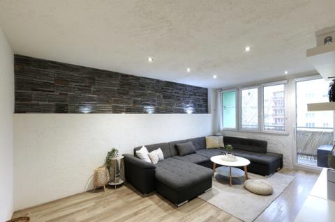 Na prodej byt o dispozici 3+1 o podlahové ploše 75,89 m². Největší výhodou bytu je lodžie s výhledem na jižní stranu. Byt je umístěn ve 4. patře zatepleného panelového domu. Interiér působí moderním dojmem díky sníženým stropům s bodovým osvětlením a dekorativním omítkám. V ložnici a obývacím pokoji jsou použity obklady v dekoru kamene. Lodžie je přístupná z obývacího pokoje. Ložnice, dětský pokoj a kuchyně jsou orientovány na sever. V obytných místnostech je položena plovoucí podlaha, v dětském pokoji koberec. Koupelna je v moderní šedo-bílé kombinaci a nabízí dostatek prostoru pro umístění pračky i sušičky. Kuchyňská linka je vybavena plynovým sporákem, digestoří a myčkou. Praktickým prvkem je prostorná obdélníková předsíň. Dům je zateplený a udržovaný. K bytu náleží sklepní kóje. V bezprostřední blízkosti jsou k dispozici dva parkovací domy a parkoviště, což zajišťuje komfortní možnosti parkování. Lokalita nabízí velmi dobrou občanskou vybavenost. Naproti domu se nachází restaurace, v okolí je více dětských hřišť. Nedaleko je plavecký bazén a supermarkety Albert a Lidl. Kousek od domu je zastávka tramvaje č. 4 s častými spoji.