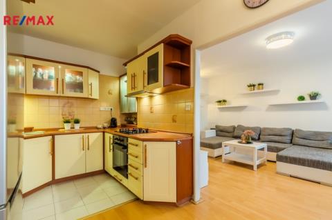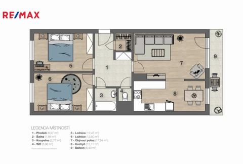 Byt nabízí velmi praktické řešení a příjemnou orientaci místností. Součástí dispozice je obývací pokoj (18,38 m²) se vstupem na prostornou zasklenou lodžii (7,14 m²), kompletně vybavená kuchyň s jídelním koutem (11,83 m²), dva neprůchozí pokoje (12,22 m² a 12,27 m²), koupelna s vanou (2,61 m²), samostatná toaleta (0,86 m²), komora (1,62 m²) a vstupní chodba (9,16 m²).