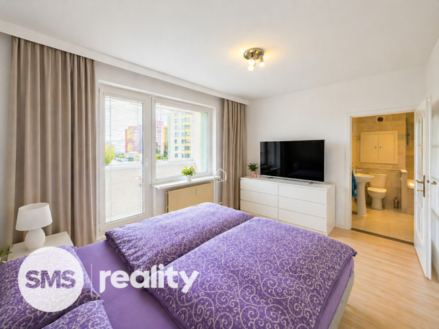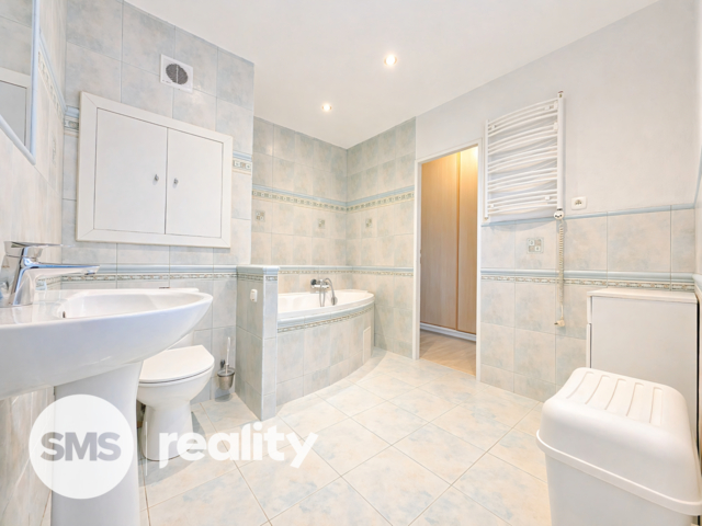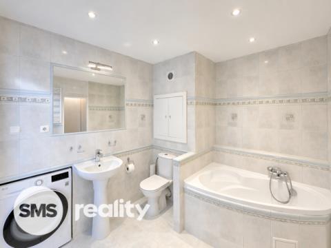 Dále z předsíně pokračujete do menšího pokoje, ideálního jako dětský pokoj či pracovna, aktuálně je pokoj využíván pro uskladnění, před stěhováním - viz. vizualizace. Na pravé straně se nachází prostorná koupelna s rohovou vanou a toaletou. Z koupelny je vstup do samostatné ložnice, ze které je přímý vstup na lodžii – ideální místo pro ranní kávu či relax.