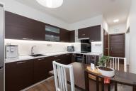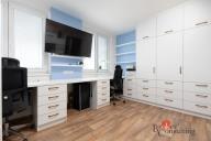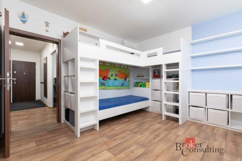 V bytě zůstane veškerý vestavěný nábytek na míru - obývací pokoj (krom gauče), dětský pokojík, ložnice, jídelní stůl, předsíňová stěna. Tzn. „stačí matrace, gauč, židle a můžete bydlet“.