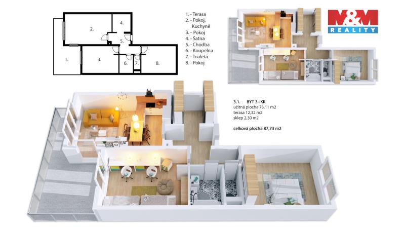 Hledáte jedinečný byt 3+kk s terasou? Byty MB Husova se nachází v centru města, jen pár kroků od parku Výstaviště. Tento byt má celkovou plochu 87,73 m². K dokonalému komfortu přispívá i prostorná terasa 12,32 m2, která nabízí dostatek prostoru pro posezení, grilování i odpočinek. Dům je postaven z nadstandardních materiálů a výhodou je pouze jeden soused na patře Byt vyniká i svou energetickou nezávislostí - je vybaven vlastním plynovým kotlem, díky kterému máte plnou kontrolu nad spotřebou i náklady. Celý dům splňuje energetickou třídu A, což zajišťuje nízké provozní výdaje a maximální úspornost. K bytu náleží i sklep a pro maximální pohodlí je možné dokoupit kryté gážové stání přímo v objektu za cenu 690.000,-Kč. S financováním Vám pomůže naše hypoteční specialistka – nyní stačí 12 % z kupní ceny, zbytek až po kolaudaci. Moderní a úsporné bydlení - to je příležitost, která čeká právě na vás!