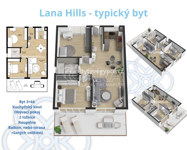 Nabízený byt 3+kk nabízí komfortní dispozici: dvě samostatné ložnice, obývací pokoj s kuchyňským koutem, balkon a koupelnu. Většina bytů v projektu poskytuje výhled na zeleň, moře nebo okolní hory.