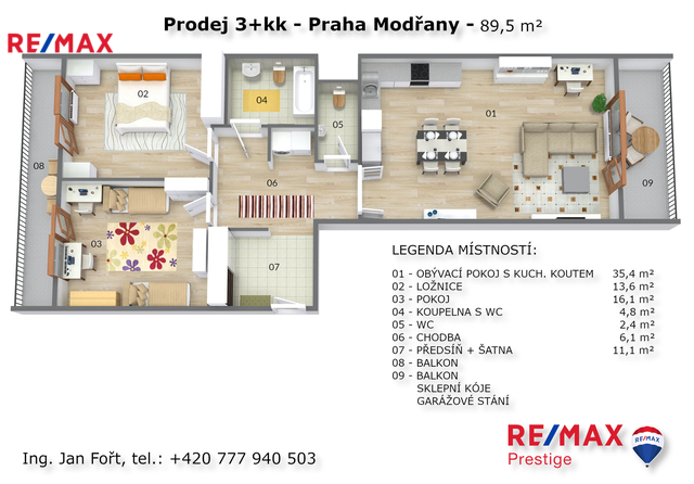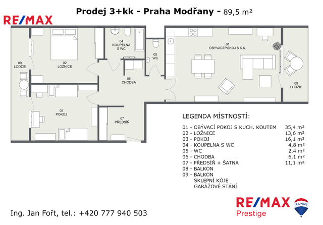 Nabízíme prodej bytu 3+kk o celkové podlahové ploše 93,8 m² + dva balkóny, umístěného v posledním – 5. nadzemním podlaží projektu Neo Riviera / Rezidence Modřanka. Byt se prodává pouze společně s garážovým stáním (550 000 Kč) a sklepní jednotkou (150 000 Kč). Byt se nachází ve fázi F, etapě C (objekty F10–F13) v Praze 4 – Modřanech. Je orientovaný na dvě světové strany a nabízí vstup na balkon z každé obytné místnosti. K dispozici jsou dva balkony o velikosti 8 m² a 9 m², garážové parkovací místo a sklepní kóje o velikosti 4,3 m². Dispozice je řešena prakticky s oddělením denní a noční části. V bytě se nachází obývací pokoj s plně vybavenou kuchyňskou linkou (35,4 m²), dvě ložnice orientované do klidné části areálu (16,1 m² a 13,6 m²), koupelna s vanou a toaletou (4,8 m²), samostatná toaleta (2,4 m²), předsíň s šatnou (11,1 m²) a chodba s komorou (6,1 m²). Součástí obytného souboru Neo Riviera / Rezidence Modřanka je upravený vnitroblok se zelení, dětským hřištěm a relaxačními zónami. Lokalita nabízí kompletní občanskou vybavenost – školy, školky, obchody, restaurace i sportoviště. V pěší vzdálenosti se nachází tramvajové a autobusové zastávky, nedaleko také vlakové spojení. Okolí poskytuje přístup na cyklostezku podél Vltavy a do přírodního parku Modřanská rokle. Pro více informací a sjednání prohlídky mě neváhejte kontaktovat Prodávající si vyhrazuje právo vybrat kupujícího na základě jím zvolených kritérií.