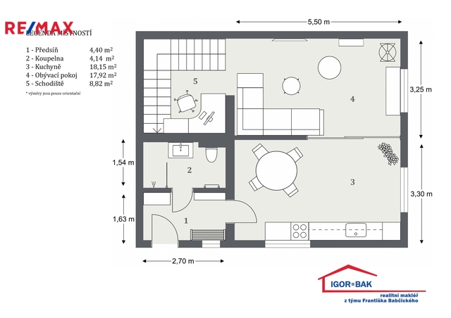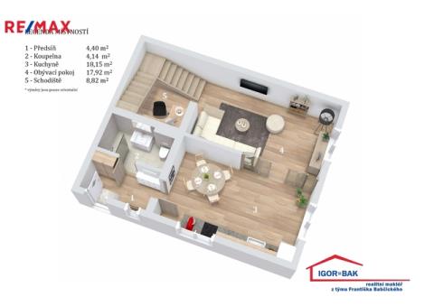 V přízemí je předsíň (4,40 m²), koupelna se sprchovým koutem a toaletou (4,14 m²) s velkoformátovou, exkluzivní dlažbou, dále kuchyně (18,15 m²), obývací pokoj (17,92 m²) a schodiště (8,82 m²).