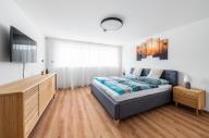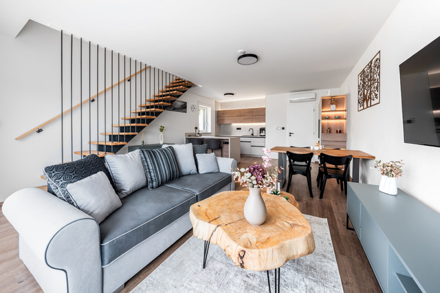 Apartmán je dokončen v nadstandardním provedení, které zahrnuje kvalitní plastohliníková okna a posuvné dveře typu HS portál s izolačním trojsklem, venkovní žaluzie, podlahové vytápění, v koupelnách navíc s topnými žebříky, nástěnné klimatizace ve všech obytných místnostech, elektrický zásobníkový ohřívač vody, zabezpečovací zařízení JABLOTRON s aplikací pro dálkové ovládání alarmu i celé domácnosti (ovládání klimatizace, topení či venkovních žaluzií), vnitřní schodiště s masivními dřevěnými nášlapy, interiérové dveře bílé s obložkovými zárubněmi, lepené vinylové podlahy v kombinaci s keramickou dlažbou, obklady či sanitu od renomovaných výrobců.