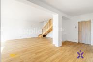 Hlavní obytný prostor tvoří velká otevřená místnost, ideální pro kuchyňský kout s jídelnou a obývací částí. Díky dvěma francouzským oknům je místnost nádherně prosvětlená a působí velmi vzdušně. Tato okna zároveň slouží jako vstup na spodní terasu, která rozšiřuje obytný prostor a nabízí místo k odpočinku. Obě patra spojuje stylové dřevěné schodiště.
