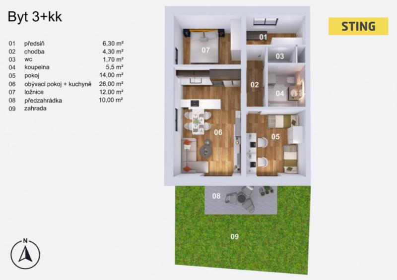 Ve výhradním zastoupení klienta vám představujeme projekt "OASA" na ulici Slezské v Malých Hošticích. Jedná se projekt "Bydlení v zahradě", který bude umístěn v krásné a žádané lokalitě v zastavěné proluce rodinných domu. Dům bude mít rezidenční charakter, prostornou zahradu se vzrostlým sadem a celý prostor bude uzavřen branou na dálkové ovládání. Každý byt je unikátní, byty v přízemí disponují terasou s krásnou předzahrádkou na jižní stranu, stejně tak byty v II. a III.N.P mají vždy luxusní, prostornou zastřešenou terasu, přístupnou z obývacího pokoje s orientací na jih. U vybraných bytů ve III.N.P. budou přiznané dřevěné stropy s loftovým charakterem. Projekt bude nabízet byty 1+KK, 2+KK a 3+KK které budou dodávány na klíč – hotové koupelny a kuchyně včetně spotřebičů, v ceně bytu budou vlastní kóje umístěné v bezprostřední blízkosti bytu. V domě bude myšleno i na bezbariérovost, k dispozici bude výtah. V areálu bude k dispozici zastřešené parkovací stání, které bude možno dokoupit. Zahájení výstavby: 12/2025. Dokončení: 05/2027. Rezervace jsou již otevřeny – kontaktujte nás pro více informací. Byt 1.1. Do konce ledna 2026 nabízíme prostřednictvím našeho partnera úrokové sazby od 4,29 % p.a. Více informací Vám sdělí náš specialista na prohlídce.