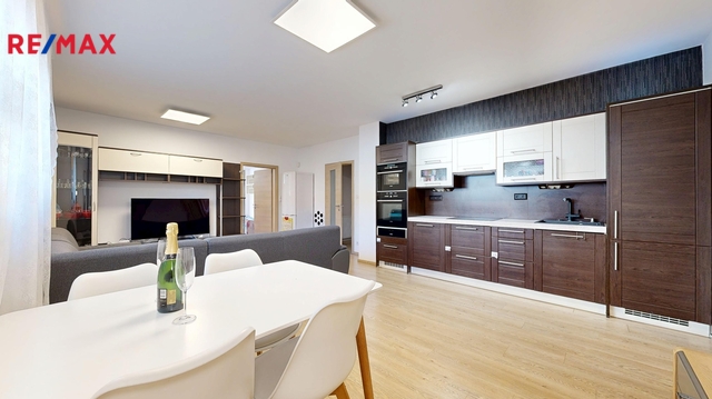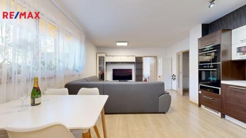 Exkluzivní nabídka bytu 3+kk se zimní zahradou, s plochou 94,2 m2 a venkovní zahradou 63 m2 tj. cekem 157,2 m2, plus podzemní parkoviště pro jedno auto a sklep 5,4 m2.