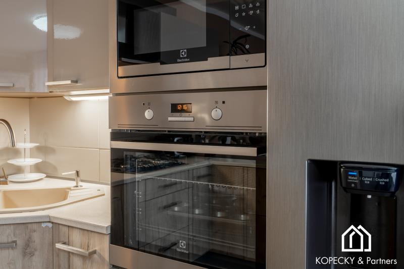 Součástí prodeje je kuchyňská linka včetně spotřebičů: myčka, plynový sporák, elektrická trouba a americká lednice. Byt je připraven tak, aby nový majitel mohl fungovat prakticky okamžitě bez řešení základního vybavení. Podlahy jsou řešeny kombinací dlažby a laminátových podlah, což je ideální jak z hlediska údržby, tak z hlediska pohodlí v obytných místnostech.