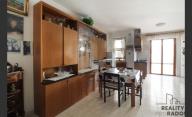Vstup do prostorného obývacího pokoje s kuchyňským koutem, ze kterého je přímý vstup na obytnou terasu s venkovní prádelnou.