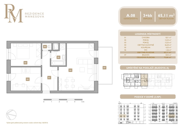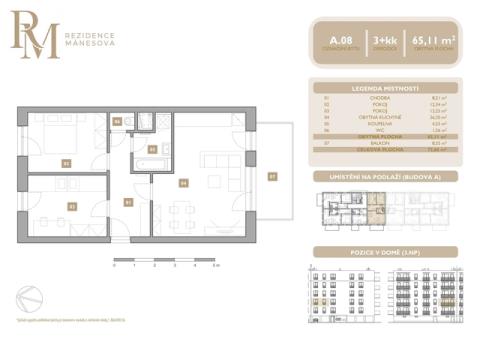 Prostorný rodinný byt 3+kk s velkým balkonem v projektu Rezidence Mánesova v Lipníku nad Bečvou nabízí nadstandardní komfort v moderním provedení. Byt je vybaven vinylovými podlahami, podlahovým teplovodním topením, kuchyňskou linkou v ceně bytu, přípravou pro venkovní žaluzie a u bytů ve 4.–6. NP také přípravou na klimatizaci. Interiérové prvky je možné zvolit ve světlé (2NP, 4NP, 6NP) nebo tmavé variantě (3NP, 5NP). Součástí prodeje je nutnost zakoupení vnitřního parkovacího stání, k bytu lze také dokoupit sklepní kóji. Rezidence Mánesova kombinuje vysoký standard, moderní architekturu a klidné prostředí menšího města s výbornou dostupností do Přerova i Olomouce. Rezidence se nachází v klidné části města s kompletní občanskou vybaveností – obchody, školy, restaurace i zastávka veřejné dopravy jsou v docházkové vzdálenosti. Kvalita provedení odpovídá olomouckým projektům, ale s výrazně dostupnější cenou. Dokončení výstavby 12/2026.