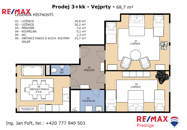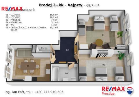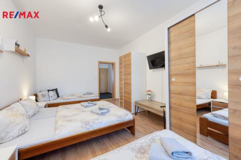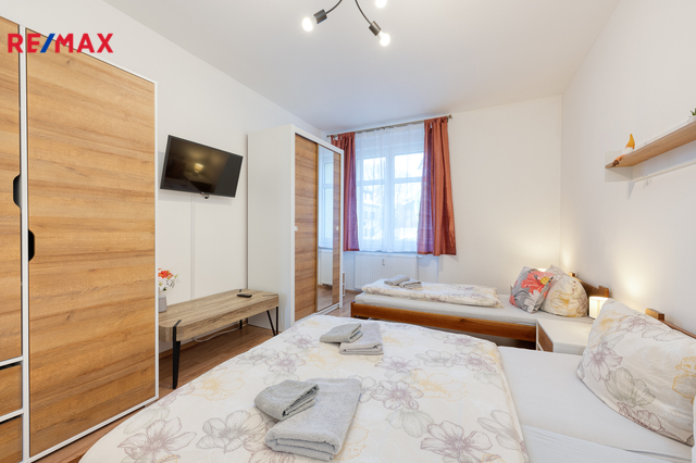 Nabízíme k prodeji apartmán o dispozici 3+kk a podlahové ploše 78,3 m², který se nachází ve Vejprtech, v srdci Krušných hor s dojezdem do skiareálu Klínovec 10 min. K apartmánu náleží také prostorný sklep o velikosti 6,4 m², vhodný například pro uložení lyží, kol nebo dalšího sportovního vybavení. Dispozice apartmánu je praktická a přehledná. Vstupní předsíň o velikosti 7,6 m² zajišťuje přístup do všech místností bytu. Obývací pokoj s kuchyňským koutem má výměru 15,7 m² a tvoří hlavní obytný prostor. Byt dále nabízí dvě samostatné ložnice o velikosti 20,2 m² a 18,8 m². Koupelna má plochu 5,1 m² a je oddělena od samostatného WC o velikosti 1,3 m². Apartmán je po kompletní rekonstrukci v roce 2019 a je připraven k okamžitému užívání. Vytápění je zde dálkové, ohřev teplé vody el. bojlerem. Ve Vejprtech je k dispozici kompletní občanská vybavenost. Nachází se zde základní a mateřská škola, zdravotnická zařízení včetně ordinací praktických lékařů a specialistů a lékárna. Nákupní možnosti zajišťuje supermarket Billa a další místní obchody. Ve městě je rovněž sportovní hala, fitness centrum, fotbalové hřiště a tenisové kurty. Pro kulturní vyžití slouží městská knihovna, kulturní centrum s pravidelnými akcemi i kino. Dopravní obslužnost zajišťuje autobusové i vlakové spojení do okolních měst a obcí. V širším okolí lze navštívit Aquapark Jáchymov, horské město Boží Dar, horu Měděnec s krásnými výhledy nebo technickou památku Blatenský příkop, oblíbenou pro pěší výlety. Apartmán je ideální volbou pro rekreační bydlení i jako investiční nemovitost k pronájmu v atraktivní horské lokalitě. Prostory si můžete projít i virtuální prohlídkou. Neváhejte mě kontaktovat pro prohlídku osobní a pro více informací