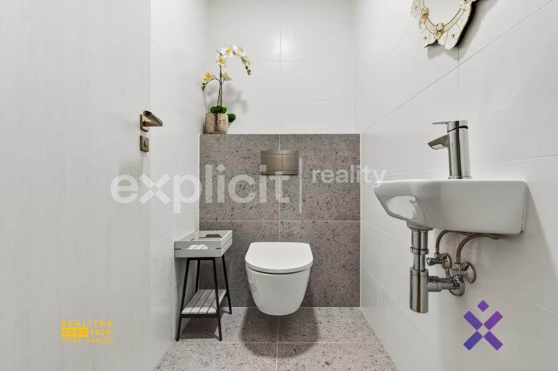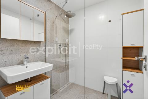 Koupelna se sprchovým koutem a elektrickým žebříkem, samostatné WC naproti ložnice, plastové okna s trojskly, venkovní elektrické žaluzie na všech oknech, sítě proti hmyzu, bezpečnostní vstupní dveře, vysoké interiérové dveře výšky 220 cm a velkým zázemím tohoto bytu je prostorná šatna přímo vedle ložnice s přípojkou na pračku i sušičku a skříně.