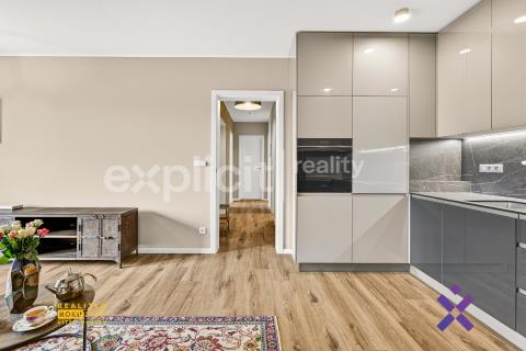 Byt s podlahovým vytápěním je vybaven luxusní kuchyňskou linkou, zhotovenou na míru, která je vybavena kvalitními spotřebiči značky Siemens - parní trouba, lednička s mrazákem, digestoř, nerez dřez. Spotřebiče jsou ještě v záruce. Velký obývací pokoj je propojen s kuchyní a vstupem na balkon s výhledem do zeleně.
