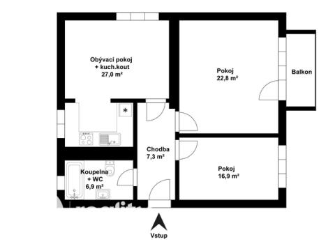 Dispozice je řešena jako 3+kk, nachází se v 1. podlaží, pokoje jsou neprůchozí, takže každý člen domácnosti má své soukromí. Jako příjemný bonus je tu balkon.