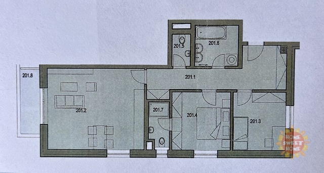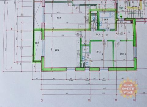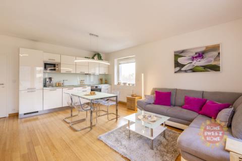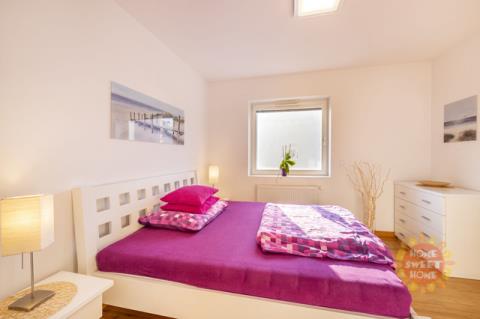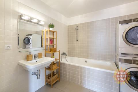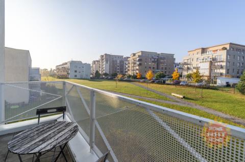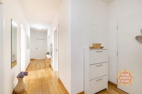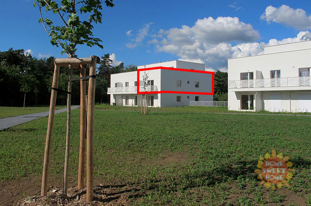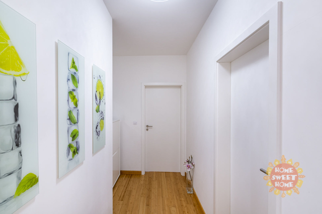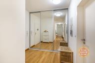 Byt sestává ze vstupní chodby (15,20m2), obývacího pokoje s kuchyňským koutem (28,70m2) a vstupem na balkón (5m2), ze kterého je krásný výhled do přilehlého parku. Kuchyň je vybavena moderními spotřebiči, včetně sklokeramické varné desky, elektrické trouby, mikrovlnné trouby, myčky, kombinované lednice, kávovaru a digestoře. Dále je zde ložnice (12,20m2) s vlastní koupelnou se sprchovým koutem a WC (3,40m2), dětský pokoj/pracovna (10,90m2) druhá velká koupelna (6,20m2) a samostatné WC (2,20m2).
