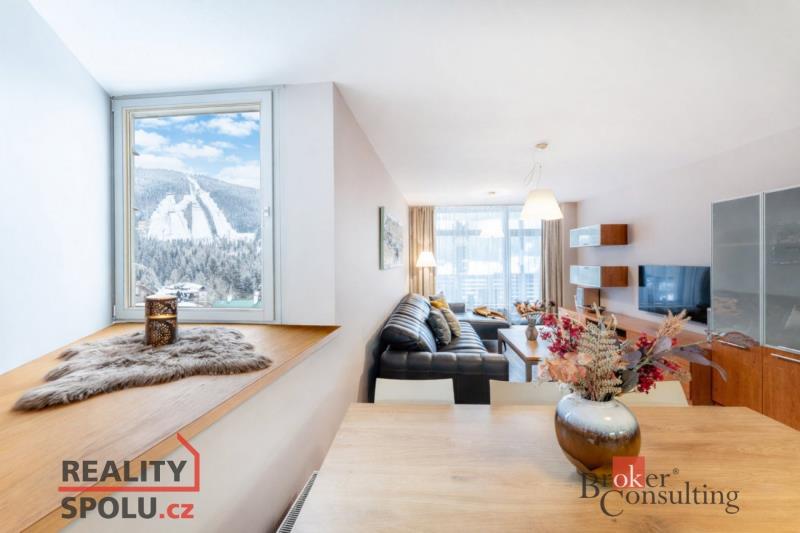 Dispozice nabízí dvě samostatné ložnice, koupelnu, oddělené WC a dostatek úložných prostor. Byt působí velmi příjemně, útulně a zároveň vzdušně. Je připravený k okamžitému užívání, ať už hledáte vlastní horské zázemí, nebo nemovitost s potenciálem krátkodobého pronájmu.