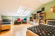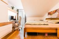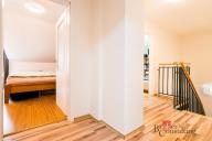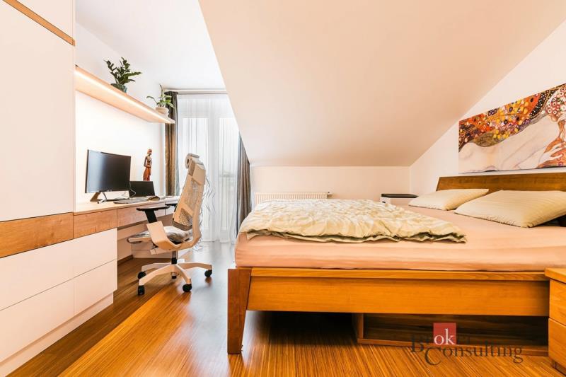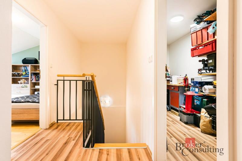 Horní podlaží tvoří klidovou část bytu. Nachází se zde dva prostorné pokoje, koupelna, samostatné WC a velkorysá komora, která poskytuje nadstandardní množství úložného prostoru. Další úložné možnosti zajišťují vestavěné skříně v předsíni, koupelně i ložnici.