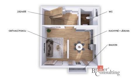Dominantou spodního podlaží je prostorný obývací pokoj s kuchyňským koutem, který přirozeně propojuje vaření, stolování i relaxaci. Z obývacího prostoru je vstup na balkon. Ve spodním podlaží se dále nachází vstupní chodba se schodištěm a samostatné WC.