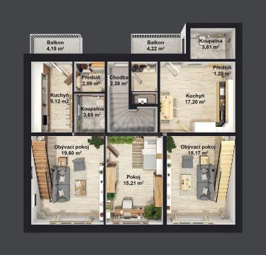 Nabízíme k prodeji nový, mezonetový byt 4+1 v osobním vlastnictví s balkónem (4,2 m2) v Kladně - Švermově - probíhá výstavba (dokončení plánováno na 09/2025). Byt o čisté obytné ploše 101,6 m2 se nachází v prvním a druhém patře zděného domu se třemi byty (další dva nové byty 3+kk a 3+1/B také k dispozici). Jedná se o nově vzniklou bytovou jednotku se dvěma koupelnami. Kupující může zvolit z finálních povrchů - obkladů, dlažeb, podlah, obložkových dveří. Vytápění v celém bytě podlahové teplovodní z vlastního plynového kotle přes který je řešen i ohřev vody. K bytu náleží sklepní kóje (4,3 m2), půdní prostor s vlastním vstupem z chodby v 2.patře (15,82 m2, kompletně foukaná izolace chytrou pěnou v podkroví) a dále k užívání pozemek vnitro-bloku o výměře 52 m2 spolu se dvěma dalšími bytovými jednotkami. V ceně je zahrnuto také vlastní parkovací stání u domu. Bližší informace v RK. Financování možné hypotékou. Rádi vyřídíme.