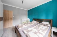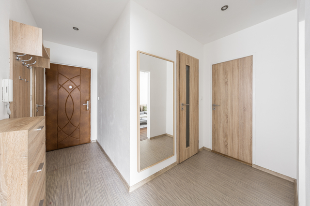 Dispozice bytu je velmi praktická. Ze vstupní předsíně a navazující chodby vedou samostatné vstupy do kuchyně, obývacího pokoje, ložnice, pracovny, koupelny i na oddělenou toaletu. Pouze dětský pokoj je přístupný přes kuchyň. Z obývacího pokoje je navíc přímý vstup na lodžii. K bytu náleží komora (1 m2) umístěná v mezipatře hned vedle bytu.