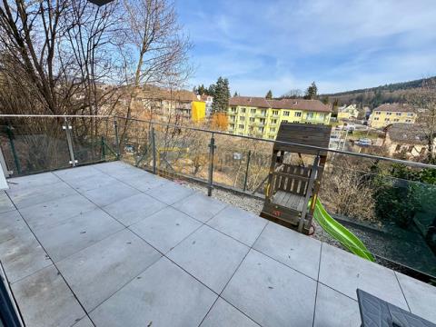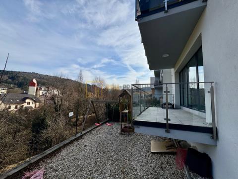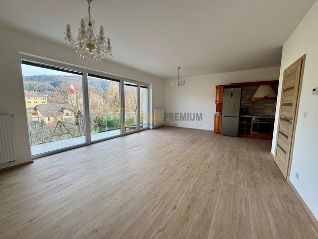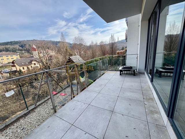 Z obývacího pokoje je vstup na prostornou terasu s výhledem do okolí. Z bytu je taky možnost vstoupit přímo na soukromou (oplocenou) zahrádku o výměře cca 50 m2.