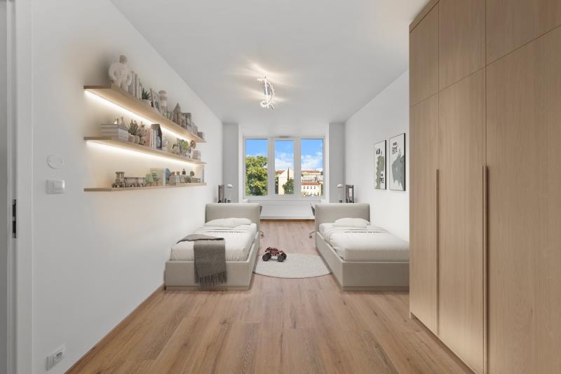 vstupní hala (14,2 m²), obývací pokoj s kuchyňským koutem (29,0 m²) s východem na balkon (10,4 m²) s výhledem do klidného vnitrobloku, pokoj se šatnou (19,7 m²), pokoj (19,5 m²), pokoj (12,3 m²), koupelna s WC (7,1 m²), samostatné WC, šatna (3,0 m²) a sklep (3,8 m²).