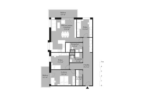 Podlahová plocha: 118,7 m² + balkóny 6,3 m² a 8,9 m² (nezapočítané do plochy bytu). Dvě garážová stání. Měsíční náklady: cca 6 900 Kč (včetně fondu oprav, bez elektřiny a internetu).