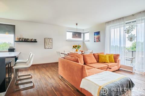Velký balkón navazující na obývací pokoj poskytuje dostatek prostoru pro venkovní posezení i grilování, druhý balkón nabízí klidné místo k odpočinku.