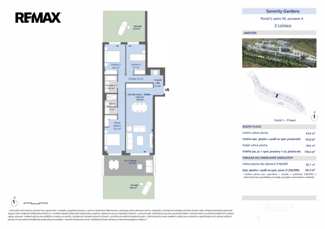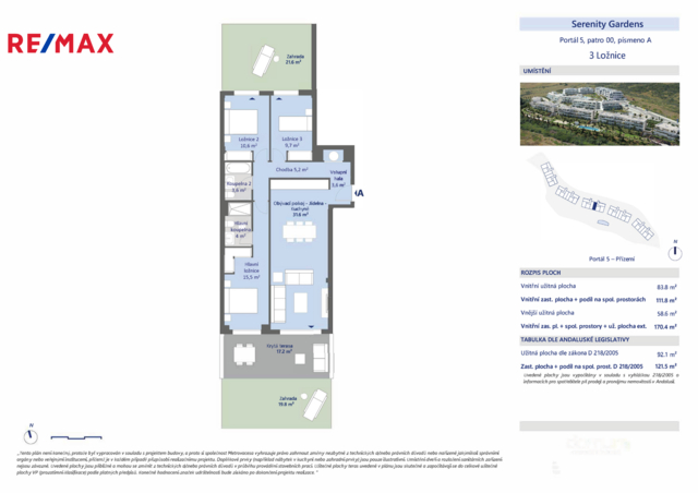 ✔ Apartmán: má rozlohu 83,8 m2 a přísluší k němu krytá terasa o velikosti 17,2 m2 a dvě předzahrádky o velikostech 19,8 a 21,6 m2