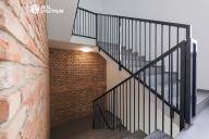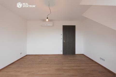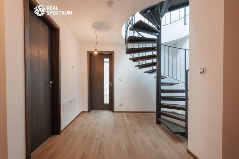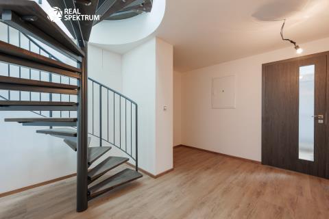 Dispozice bytu: vstup (3,1 m²), schodišťová hala (18,6 m²), obývací pokoj s kuchyňským koutem (65,0 m²), komora (5,4m²), technická místnost (3,8 m²), pokoj (17,1 m²), pokoj (13,9 m²), koupelna (5,5 m²), WC (2,1 m²), balkon (13,8 m²), galerie (3,9 m²), pracovna/pokoj (25,0 m²), WC (3,5 m²)