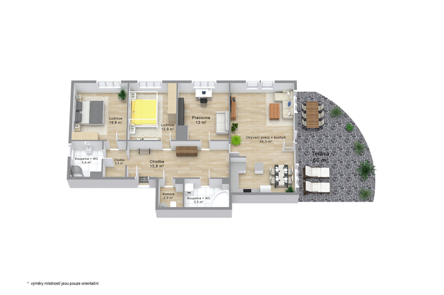 Nabízíme k prodeji prostorný a velmi světlý byt 4+kk o velikosti 120 m², který se nachází v moderním rezidenčním domě ve vyhledávané části Slaného, v ulici Kybalova. K bytu náleží terasa s předzahrádkou o celkové výměře 60 m², kryté parkovací stání a sklepní kóje v suterénu domu. Byt se pyšní promyšlenou dispozicí, která poskytuje dostatek soukromí i společného prostoru pro celou rodinu. - Prostorná vstupní chodba se samostatnými vstupy do všech místností - Obytný prostor s kuchyňským koutem a přímým vstupem na terasu - Tři ložnice, z nichž hlavní disponuje vlastní šatnou a en-suite koupelnou s toaletou - Druhá koupelna s vanou a toaletou - Praktická komora přímo v bytě Velká okna zajišťují dostatek denního světla a příjemnou vzdušnost interiéru. Na terase je připravené posezení obklopené zelení – keři a květinami – ideální místo pro relaxaci nebo setkání s přáteli. Celý areál je oplocený, velmi pěkně udržovaný a nabízí bezpečné prostředí pro klidné rodinné bydlení. Součástí komplexu je také dětské hřiště, které ocení rodiny s dětmi. Byt se nachází v klidné a moderní rezidenční zástavbě města Slaný. V docházkové vzdálenosti naleznete kompletní občanskou vybavenost – mateřskou a základní školu, supermarket a menší obchody s potravinami, lékárnu, zdravotní středisko a poštu, kavárny, restaurace a pekárnu, sportovní areál, plavecký bazén a fitness centrum, autobusovou zastávku s přímým spojením do Prahy. Historické centrum města s náměstím a kulturním vyžitím je vzdálené jen několik minut chůze. Slaný má výborné spojení do Prahy – autem jste za cca. 20 minut na okraji metropole (Letiště Václava Havla), do centra Prahy se dostanete přibližně za 30 minut. Autobusové linky zajišťují pravidelné a rychlé spojení s Prahou i okolními městy. Tento byt je ideální volbou pro rodiny, které hledají komfortní a moderní bydlení s výhodou vlastní zahrádky a skvělé dostupnosti do Prahy.