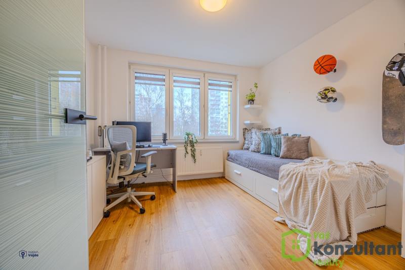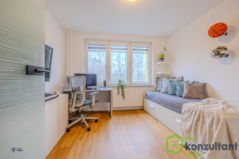 V bytě jsou čtyři pokoje, v tuto chvíli sloužící jako ložnice, obývací pokoj s kuchyní a dva dětské pokoje. Dále byt disponuje prostornou šatnou. Z ložnice je vstup na zasklenou lodžii. V bytě je klasické ústřední topení, studená i teplá voda z vodovodního řádu a protipožární vchodové dveře s bezpečnostním zámkem.