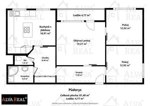 Dispozice: Obývací pokoj 19,27 m²; pokoj 12,02 m²; pokoj 12,02 m²; kuchyně s jídelnou 16,91 m²; koupelna 3,8 m²; WC 1,6 m²; chodba 8,46 m²; předsíň 7,38 m²; lodžie 4,77 m²; sklep 2,52 m².