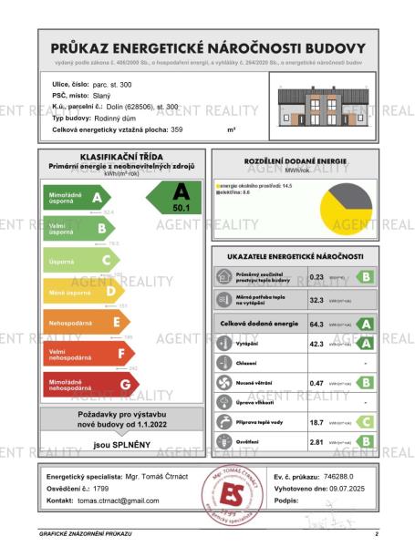AGENT Reality nabízí exkluzivně k prodeji jednotku 186/60BB domu o dispozici 5+kk (6+kk), bytové plochy 140,89 m2 se zahradou 671 m2 v lokalitě Slaný - Dolín. Byt se nachází v novostavbě bytového domu o dvou jednotkách s vlastním vchodem oddělenou terasou. Vlastní parkovací místo pro tři vozy na pozemku před vchodem do domu. Nízkoenergetický dům, vystavěný na dvě samostatné nezávislé jednotky pod jedním číslem popisným. Společné plochy včetně zahrady jsou vymezeny výhradním právem užívání části pozemku cca. 671 m2 m2 . Objekt domu vystavěn jako dřevostavba, založená na betonových pasech a základové desce. Stavba je dvoupodlažní, nepodsklepená, zastřešena sedlovou střechou. Střešní krytina je plechová falcovaná. Vnější výplně otvorů plastové. Okna plastová s trojsklem.. Hlavním zdrojem tepla pro každou bytovou jednotku je tepelné čerpadlo vzduch/voda se zásobníkem TUV + teplovodní podlahové topení a bude provedena přeprava pro kamna na tuhá paliva. Anergetická náročnost budovy třída A. Dispozice samotných bytových jednotek jsou identické zrcadlově orientované. Po vstupu do bytové jednotky objektu se nacházíme v zádveří, zde se jde do technické místnosti, pracovny, šatny a chodby se schodištěm. Odtud je přístupná koupelna s WC a kuchyně s jídelnou a obývacím pokojem. V podkroví se nachází pokoje a 2 koupelnY s WC a šatní místnost rodičovské ložnice. Zpevněné plochy ke každé jednotce domu patří zpevněná plocha z betonové zámkové dlažby umístěna před vstupem do objektu (cca 60 m2) pro možnost parkování osobních aut navazující na sjezd na komunikaci. Za každou bytovou jednotkou se nachází terasa z betonové dlažby (cca 30 m2) na kterou je přístup z obývacího pokoje. Terénní úpravy na pozemku budou provedeny úpravou pro vyrovnání terénu okolo objektu. Venkovní osvětlení na obvodových stěnách objektu jsou umístěné nástěnná venkovní svítidla (ze strany vstupu do objektu a terasy). V oknech příprava na rolety/žaluzie. Oplocení pozemku ze strany přilehlých pozemkových parcel bude použito oplocení z pletiva odolného povětrnostním vlivům, korozi a UV záření. Ze strany ulici je betové oplocení bez výplně. Majitelé budou mít možnost zvolit si interiér (podlahy, zárubně, sanitu a kuchyň) a to na základě určených standardů. Případně je možné za příplatek provést i změnu podle přání klientů. Předpokládaný termín dokončené a zkolaudované stavby bude v druhé polovině roku 2025. Podrobnější informace s nabídku zašleme vážnému zájemci. Těšíme se i na případnou schůzku s vámi v termínu, který navrhnete.