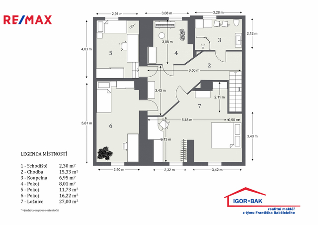 V horní části mezonetu se nacházejí čtyři pokoje o výměrách 27,00 m², 16,22 m², 11,73 m² a 8,01 m². Patro dále nabízí koupelnu (6,95 m²) s přípravou na vanu, prostornou chodbu (15,33 m²) a schodiště (2,30 m²).