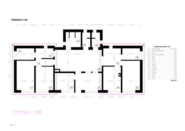Celková vnitřní plocha činí přibližně 149,1 m². Dominantou nemovitosti je prostorný společenský prostor 48,8 m². K dispozici je 6 samostatných pokojů + 1 pokoj pro čtyři osoby před dokončením - chybí pouze zárubně a dveře, zásuvky a vypínače k el. vedení a PVC, nebo jiná podlaha na hotovou stěrku. Objekt nabízí koupelnu - dva sprchové kouty, dvě toalety se samostatnou místností s umyvadly, zrcadlem a další technické prostory, které umožňují ubytování většího počtu osob a využití pro pronájmy.