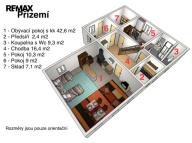 Přízemí: zádveří, obývací pokoj s kuchyňským koutem (2+kk), koupelna s WC, samostatný pokoj, veranda, sklep, vstup na zahradu.