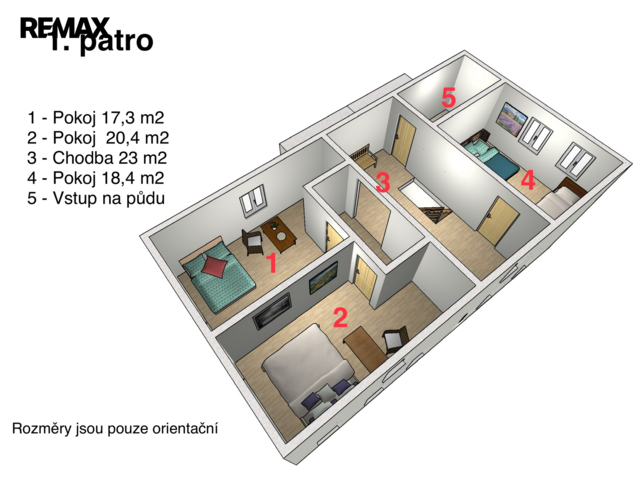 1. NP: chodba, tři pokoje, vstup na suchou půdu (možnost rozšíření obytného prostoru).