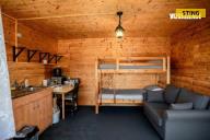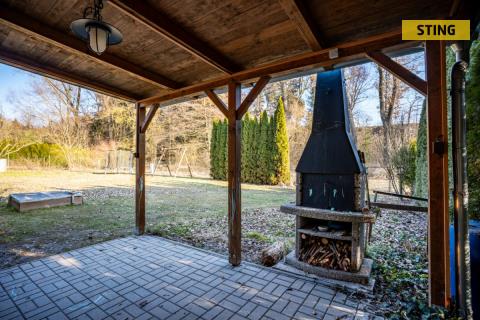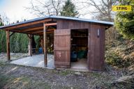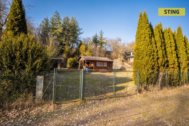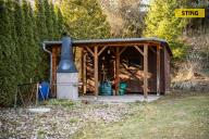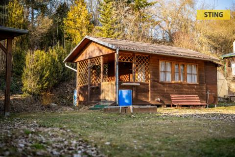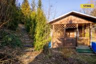Na pozemku se nachází dřevěná chata s verandou, která nabízí příjemné zázemí pro víkendový relax. Vedle chaty je vybudována zastřešená pergola s venkovním krbem, ideální pro grilování a posezení s rodinou či přáteli.
