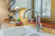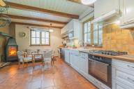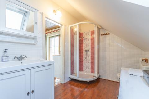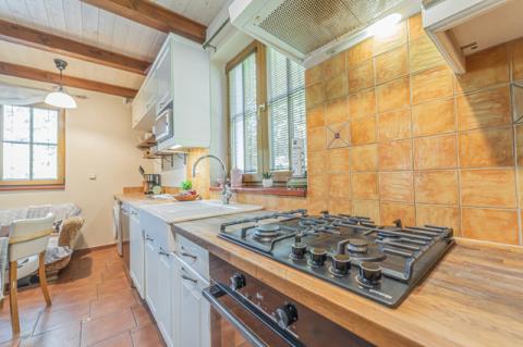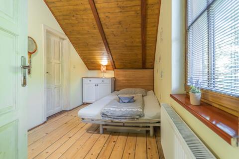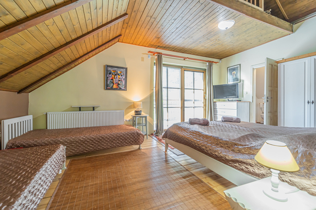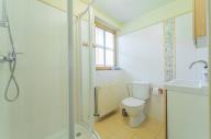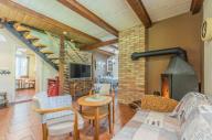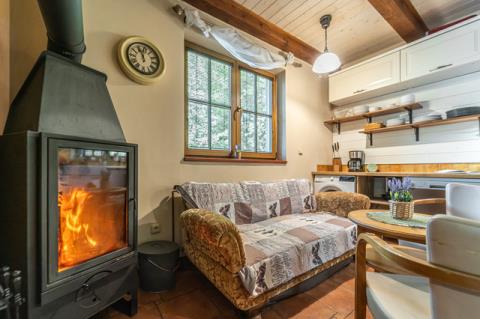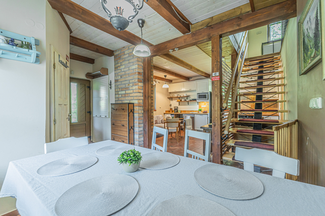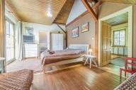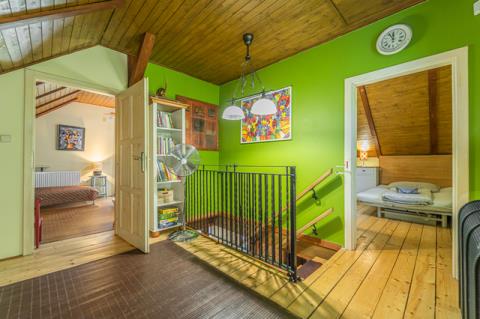 V přízemí chalupy po vstupu z haly najdete velkou obytnou místnost s krbovými kamny, plně vybavenou kuchyň a jídelní kout. Také je zde první ložnice a balkon s posezením, první koupelna s WC a sprchovým koutem. Po schodech vyjdeme do patra, kde je společný prostor k odpočinku. Dále je v patře druhá ložnice, která má svůj balkon s krásným výhledem na Berounku a třetí ložnice. K ložnicím náleží koupelna s WC a sprchovým koutem, umyvadlem a šatním koutem. Koupelna je průchozí z obou ložnic.