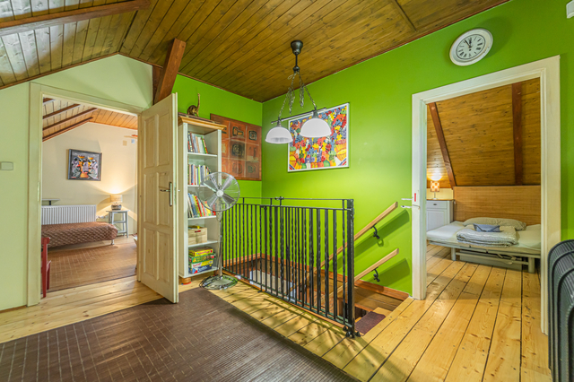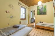 Chalupa nabízí celkem tři ložnice (14, 10 a 18 m2), kde pohodlně přespí až 9 osob, dvě haly (10 a 12 m2), obytnou místnost s kuchyní (20 m2), dvě koupelny s WC (10 a 3 m2), technickou místnost (12 m2), komoru (1,7 m2), dva sklepy (11 a 5 m2), dva balkony, terasu malou půdu.