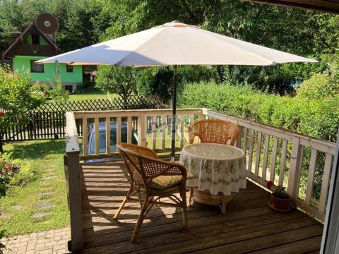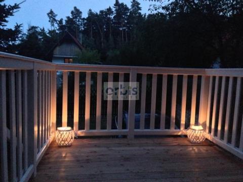 Nabízíme k prodeji krásnou chatu, cca 84 m2 po kompletní rekonstrukci, nacházející se v klidné chatové oblasti v obci Líský u Slaného, v podhůří Českého středohoří. Chata stojí na vlastním oploceném pozemku o výměře 417 m2. Stavba je ve výborném technickém stavu a je vhodná nejen k rekreaci, ale i k trvalému bydlení. Vybavení je součástí prodeje. Nemovitost je napojena na elektřinu, obecní vodovod a kanalizaci. K dispozici je také vlastní studna s užitkovou vodou. Dalším zdrojem užitkové vody je 5 m3 velká nádrž pod zemí (bývalá jímka). Vytápění je řešeno kombinovanými krbovými kamny, která lze snadno přepnout buď na elektrický provoz, nebo topit dřevem. Ohřev vody el. boilerem. Dispozičně je chata řešena: V přízemí se nachází vstupní prostor s technickým zázemím. V prvním patře je prostorná kuchyň s velkou kuchyňskou linkou, elektrickou troubou, sklokeramickou varnou deskou a lednicí. Navazuje na ni obývací prostor s rozkládací pohovkou a vstupem na terasu skrze velké prosklené francouzské okno orientované na jih, V létě lze terasu zastínit velkým slunečníkem. Dále je zde samostatná místnost vhodná jako ložnice, pracovna a koupelna se sprchovým koutem a WC. V podkroví se nachází útulná ložnice a balkón. Jižní orientace chaty přináší nejen krásné celodenní světlo, ale i úsporu na vytápění během zimy. Na podlahách jsou dřevěné parkety a dřevěná prkenná podlaha, v ložnici PVC. V rohu pozemku se nachází větší zahradní domek vhodný pro uskladnění nářadí nebo jako dílna, možné předělat jako další místo pro letní ložnici. Součástí prodeje je i kompletní zahradnické vybavení sekačka, vapka, drtička větví a další nástroje pro údržbu zahrady. Líský u Slaného je klidná lokalita v těsné blízkosti lesa, ideální pro milovníky přírody, s výbornou dostupností do Slaného (cca 10 minut), Prahy (cca 40 minut) a Louny (cca 20min). Pro více informací mě neváhejte kontaktovat.
