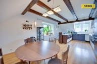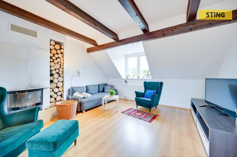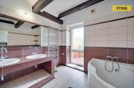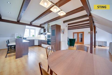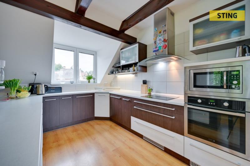Bytová jednotka 3+kk: moderní kuchyňský kout s barem a jídelním koutem, obývací pokoj s balkonem a krbovými kamny, dvě ložnice (vč. ložnice se šatnou), koupelna s vanou a prostorem pro sprchový kout, dvě umyvadla a vstup na balkon, samostatné WC