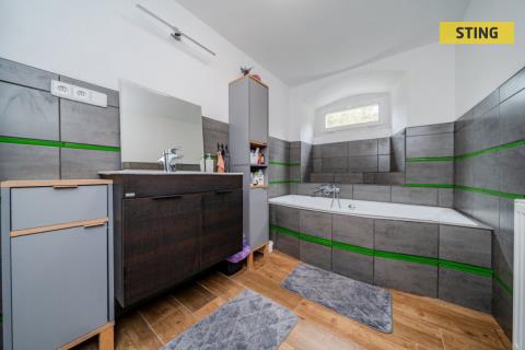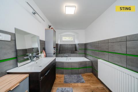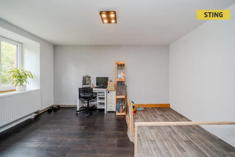 V přízemí je bytová jednotka o dispozici 3+kk a podlahové ploše 90 m2, po rekonstrukci, která proběhla v r. 2022, nabízí kuchyni s kuchyňskou linkou se spotřebiči : indukční deska s troubou, myčka, lednice. Obývací prostor s krbovými kachlovými kamny, pracovna, ložnice s šatnou, koupelna s umyvadlem a umyvadlovou skříni, vana, samostatná toaleta. Podlahy beton a PVC. Z chodby vstup do sklepa, kotelny a druhého patra.