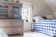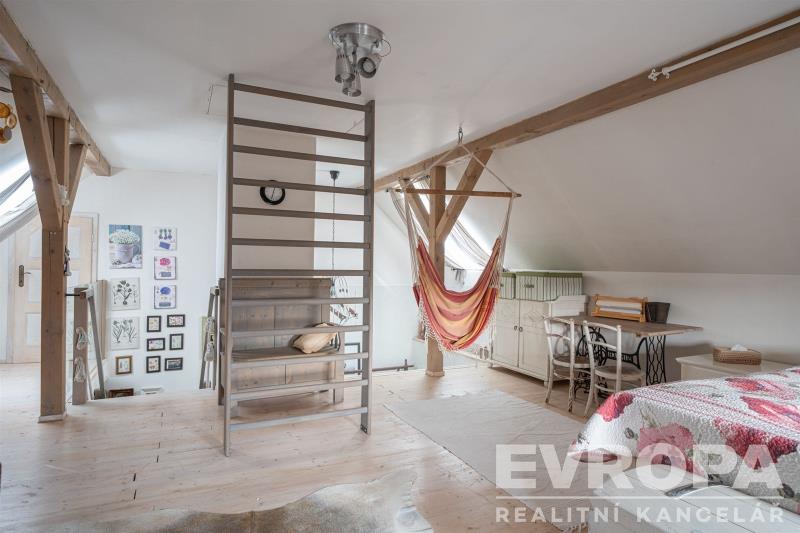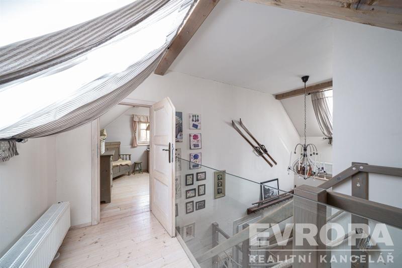 Po dřevěných schodech se dostanete do patra, kde se nachází obytná galerie a samostatná ložnice.