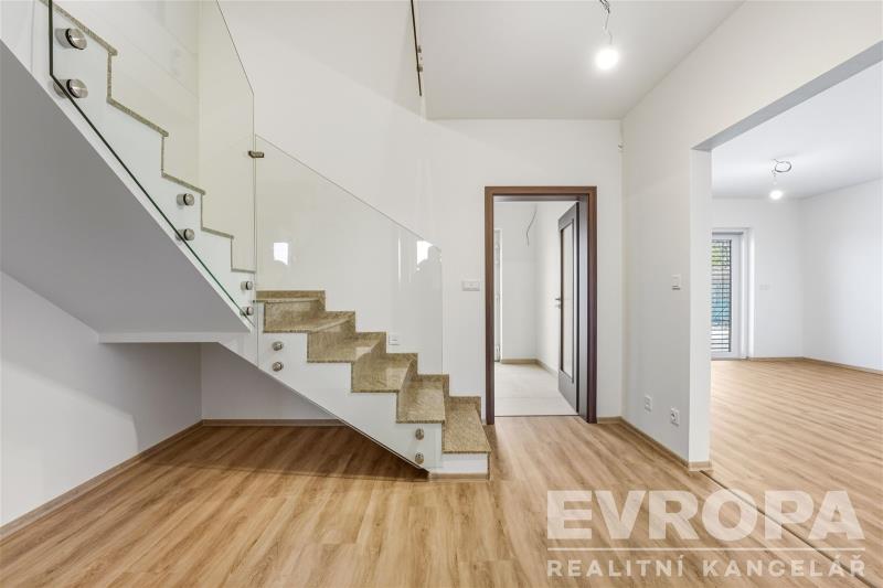 Dominantou prostorné chodby je betonové schodiště v mramoru opatřené moderním skleněným zábradlím a osvětlením schodišťových nášlapů na pohybový a světelný senzor. Pod schodištěm je veliký prostor, který nabízí další praktické využití.