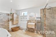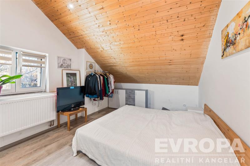 V patře jsou dva pokoje, ložnice (16,17 m2) a dětský pokoj (17 m2) a chodba (13,14 m2) a malá šatnička.
