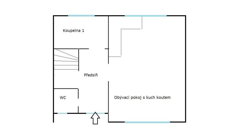 V prvním patře se nachází prostorný obývací pokoj s kuchyňským koutem cca 40 m2 s vstupem na terasu a zahradu, WC, zádveří a koupelna cca 10 m2.